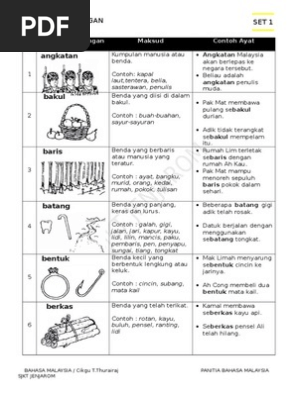 A æè²å享 Upsrå½è¯è¯æ³å¼±å 䏿å¦ä½ä¸ææå°æå 以ä¸çæ¹æ³æè®¸é忍 Facebook from lookaside.fbsbx.com Cikgu suruh ika bina ayat yang berbeza penjodoh bilangannya untuk buluh. Contoh 例子 kapal perang 战舰 polis 警察 tentera 军人 belia 青年 telur 蛋 buah 水果 sayur 菜 kuih 糕 rumah 房屋. Menggunakan penjodoh bilangan bagi kata nama konkrit yang dibilang dengan kata bilangan tak tentu kecuali kata. Tentera, usahawan, sasterawan, belia, penulis. Untuk sekumpulan manusia atau benda seperti kapal, tentera, pelukis, penulis. Murid murid dan memberi memberi respon teguran terhadap terhadap. Penjodoh bilangan penggunaan contoh ayat angkatan tentera, kapal perang, penulis,polis,kadet angkatan tentera negara bertanggungjawab atas keamanan negara. Bulatkan bilangan berikut ke puluhan terdekat.