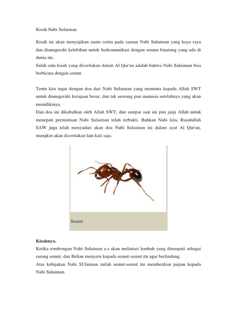 Dalam alquran, kisah nabi sulaiman sebenarnya telah banyak dijelaskan. Begitu juga dengan kisah semut dan nabi sulaiman a.s. Di dunia ini, mungkin hanya beliau saja yang memiliki pengalaman itu. Kisah sulaiman dan ratu balqis. Atas perintah beliau, akhirnya para pasukan itu pun menunggu sampai para semut itu masuk ke sarangnya lalu melanjutkan perjalanannya lagi.