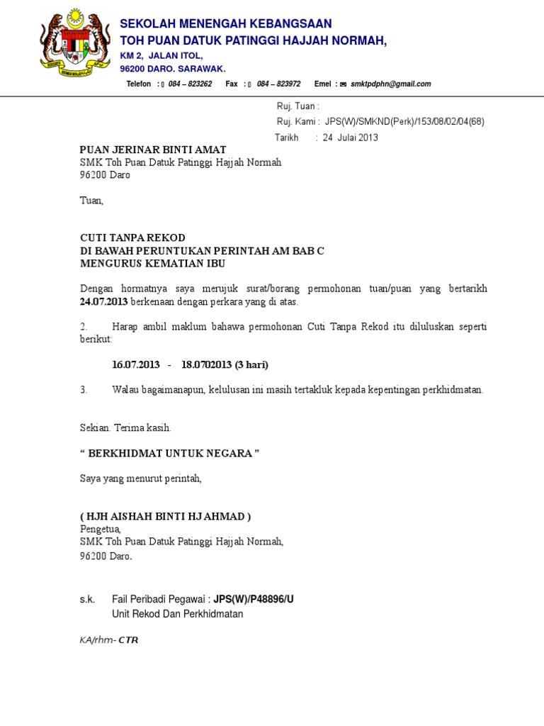 Saya memohon menggunakan kemudahan cuti bersalin tanpa gaji (tanpa dibayar emolumen) berikut: Cuti untuk mengambil bahagian dalam olahraga/sukan. Ctr bagi pegawai yang dilantik sebagai jurulatih plkn. Berkuatkuasa pada 1 julai, kemudahan cuti tiga hari bagi urusan kematian anggota keluarga terdekat akan diberikan buat penjawat awam. Cuti tanpa rekod cuti kematian cuti kematian ahli keluarga kemudahan cuti tanpa rekod bagi urusan kematian ahli keluarga terdekat trainees2013 borang cuti tanpa cute766 permohonan kemudahan cuti tanpa rekod di bawah pekeliling perkhidmatan bilangan 4 tahun 5.